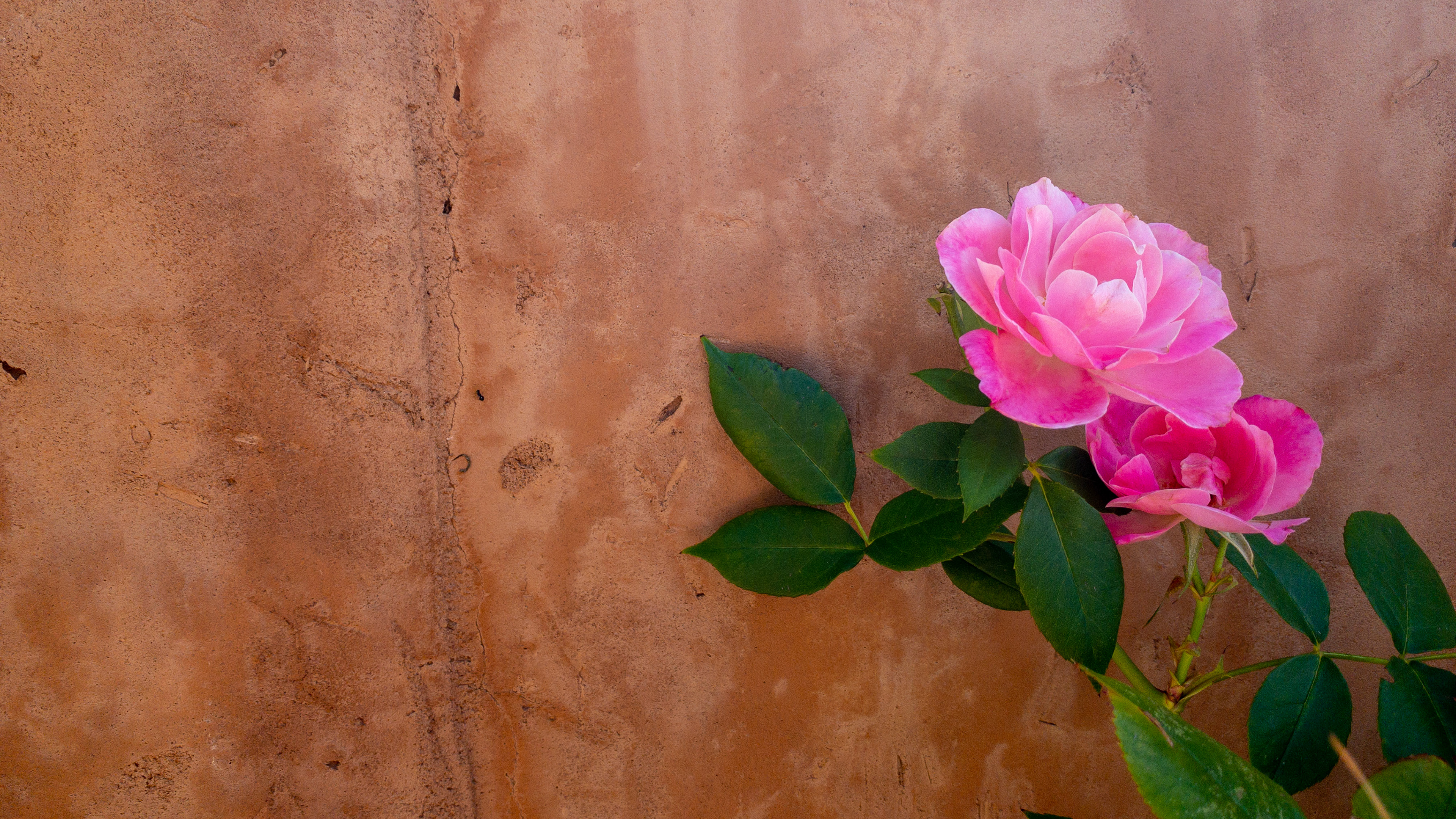An adobe wall along a Santa Fe residential street hugged by a rose.