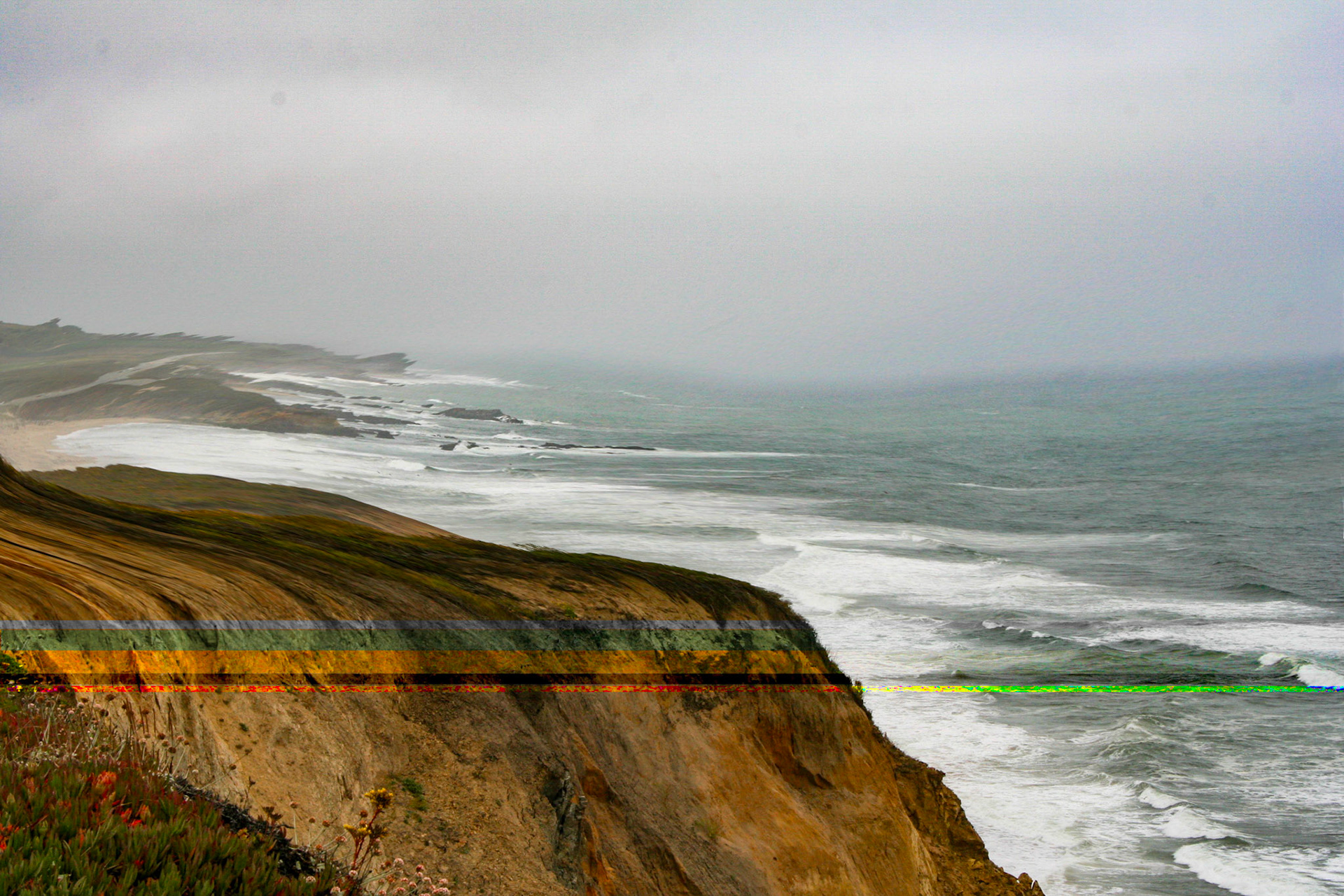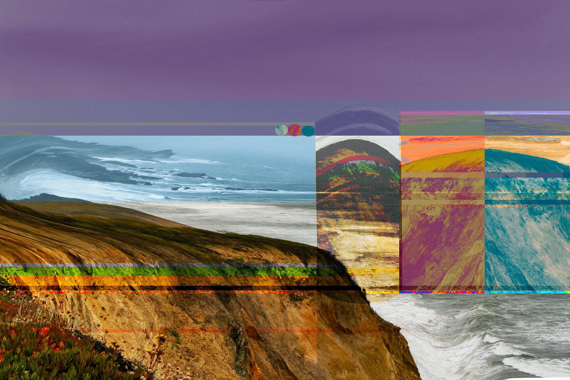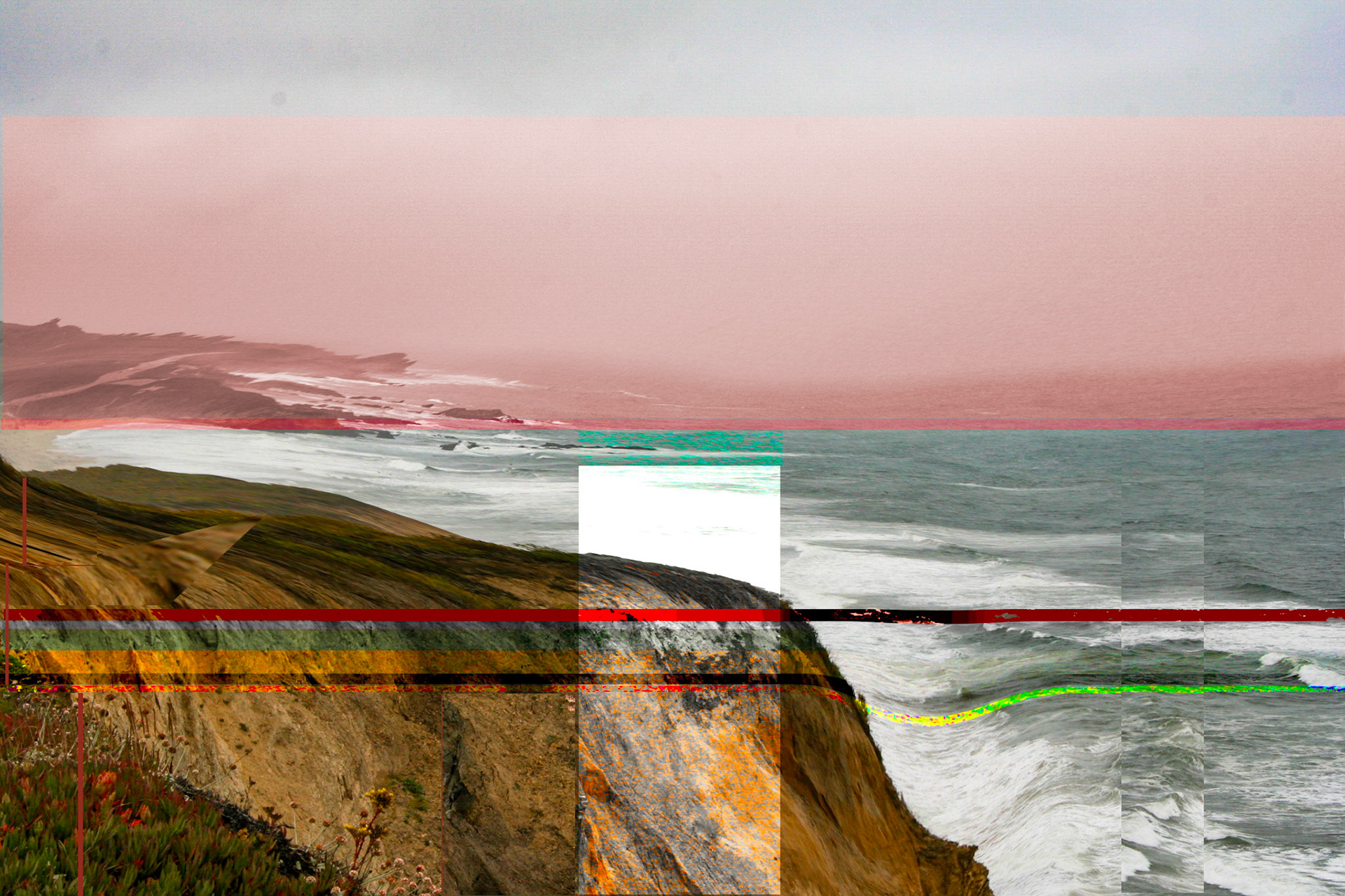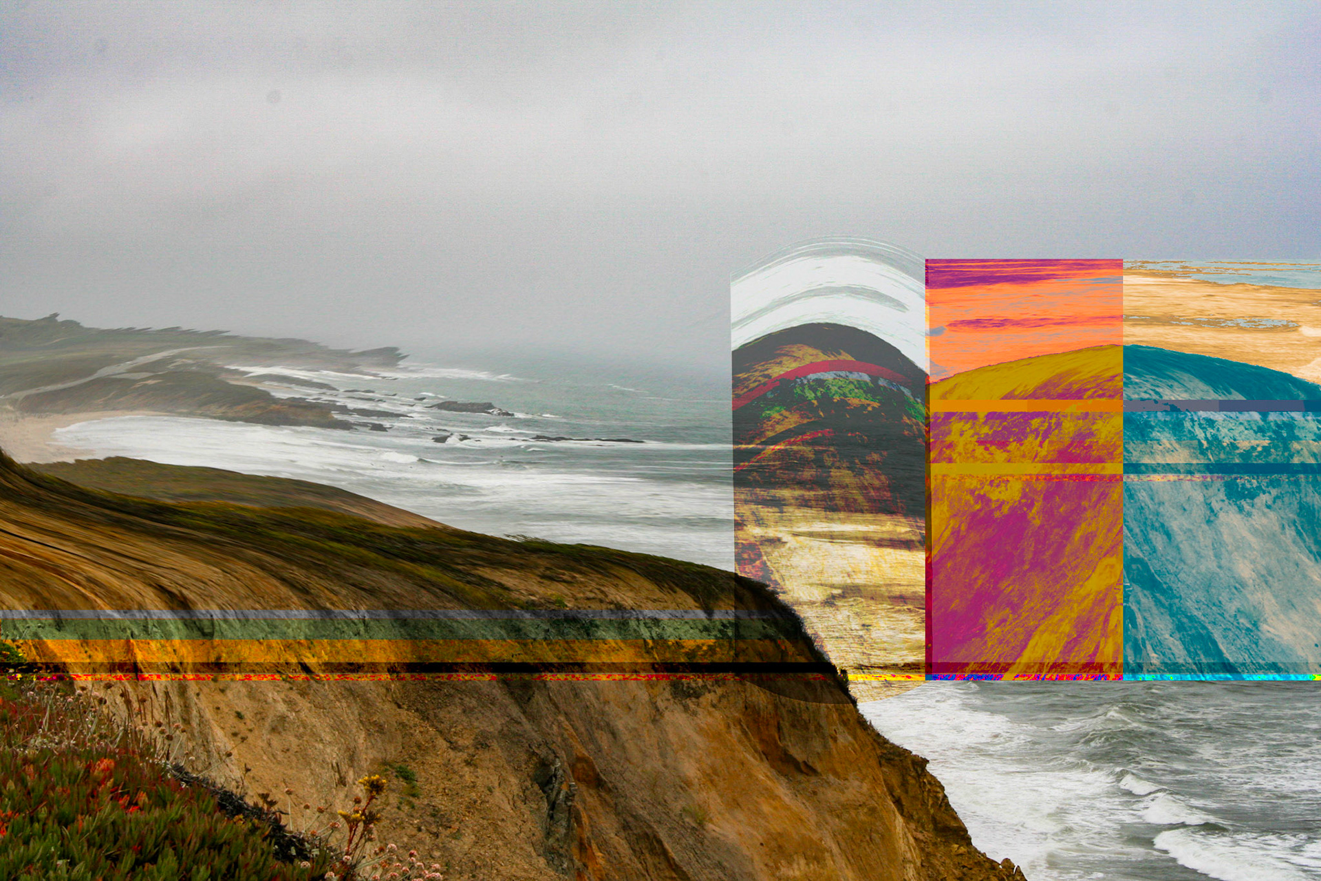 Imaged visions of the gradual effect on the California cost of the long prognosticated San Andreas earthquake. The images of the series represent a visual timeline from ones vantage point above the Big Sur area of California.